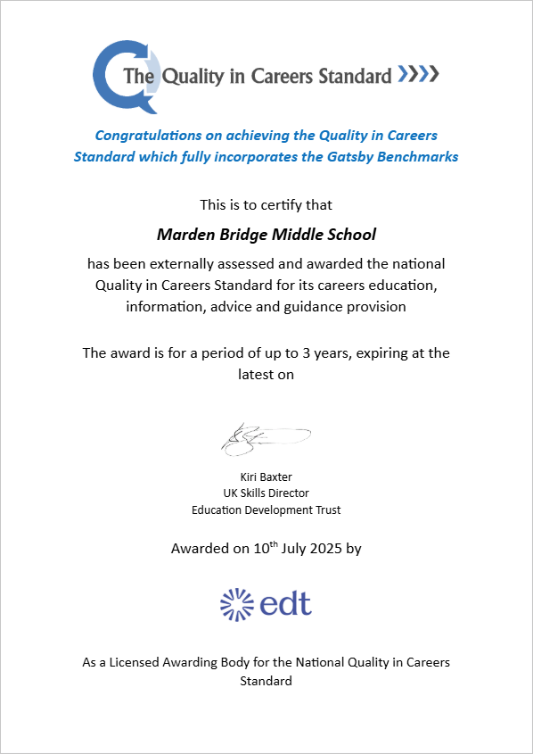 The report identified eight benchmarks that are the core dimensions of good careers and enterprise provision in schools. These benchmarks are a central component of the Department for Education's  Careers guidance and access for education and training providers strategy, first published in December 2017,  updated in 2023 and again in 2025.  These benchmarks are what we as a school strive to achieve every day for all students at Marden Bridge Middle School.